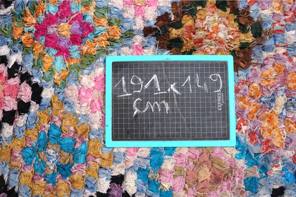 unique piece, there are no two similar in this world originated from the creative mind of a berber lady made entirely from cotton = 100% boucherouite – pieces of cut cotton clothing (recycled) were woven into the cotton base the carpet could even be turned around to its kilim side, so you actually have two carpets for the price of one
