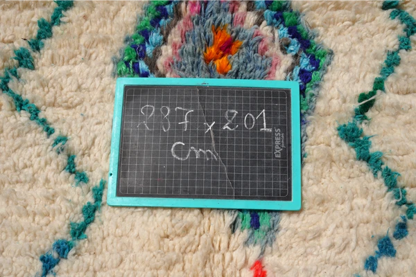 handgeknoopt wollen tapijt uit de geest van een berber dame ontstaan: uniek stuk, zo bestaan er geen twee op deze wereld origine: ourika typisch vrouwelijke symboliek vd ruiten 2m87 x 2m01 hoofdkleuren: wit met accenten blauw, groen, oranje, geel en roze