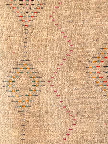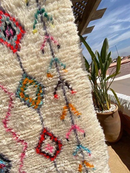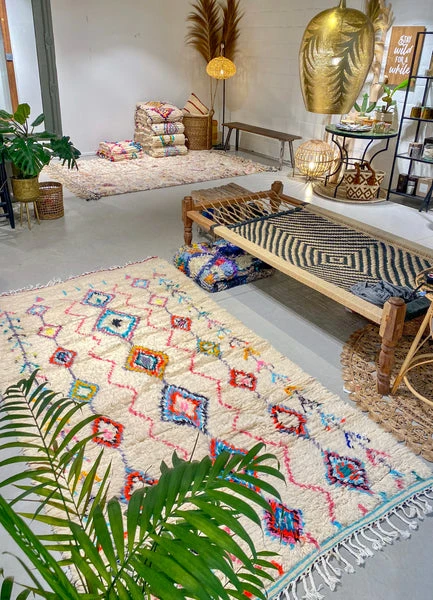 handgeknoopt wollen tapijt uit de geest van een berber dame ontstaan: uniek stuk, zo bestaan er geen twee op deze wereld origine: ourika typisch vrouwelijke symboliek vd ruiten 2m53 x 1m40 hoofdkleuren: wit met accenten roze, blauw, geel en oranje – oυrιкα – M’n nieuwste crush… Ourika rugs: de allermooiste, traditionele wollen berbertapijten met een kleurrijke moderne twist. We hebben er zoooo veel ingekocht 🤩 De basis is telkens wit / naturel, met een contrastrijk ruitjes- en zigzagpatroon dat telkens weer uniek is. T zijn ware kunstwerkjes… We kochten zowel de kleine maatjes (die super cute zijn voor in de babykamer bijvb) als de grote formaten die je woonkamer een heerlijke warme gloed geven. rechtstreekse invoer Tijdens mijn inkoopreizen naar Marokko ga ik telkens op zoek naar prachtige unieke stukken die mooi kunnen passen binnen ons escape concept. Ik bied mee met de lokale koopslieden op de criée berbère van de tapijtensouks in hartje Marrakech, waardoor de meeste tussenkanalen worden overgeslaan! onderhoudsadvies Het wollen tapijt kan niet in de machine gewassen worden. Reinigen kan enkel met stofzuigen / uitkloppen en op traditionele methode met water en bruine zeep. Geduldig laten drogen in het zonnetje.