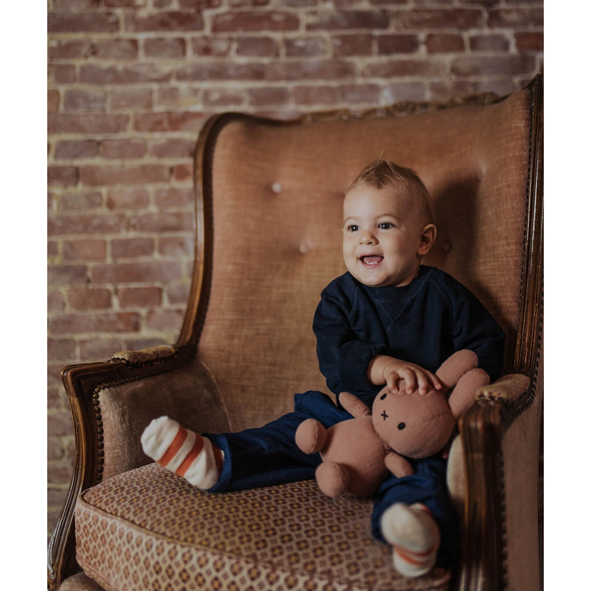 The iconic Miffy Rabbit has been designed in a soft muslin with stitched eyes and a nose. A beautiful soft toy gift, suitable from birth. The Miffy soft toys are consistent with the philosophy of Miffy’s artistic father Dick Bruna, who believes toys need to enable and enhance play. Our Miffy and Melanie plushies are all produced according to the highest standards of ethical production. We’re proud of being certified by the ICTI – Ethical Toy Program and committed to building better lives for workers around the world. For the stuffing of our Plush, we use 100% recycled PET bottles Colour: Biscuit Dimensions: 23cm Composition: Outer fabric: 100% Cotton; Filling: 100% recycled pet bottle stuffing Care Instructions: Hand wash only